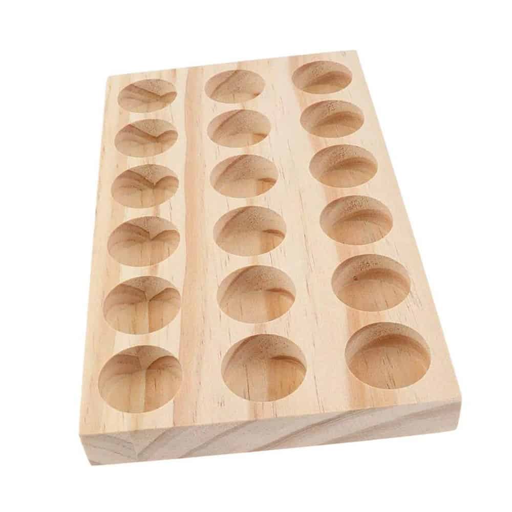 Mooi Houten presentatie display 18 vakken essentiële olie flesjes, vitrine display voor het opbergen, bewaren en presenteren van totaal +- 18 flesjes. Deze houten plank met 18 ronde vakken +- 28 mm x 28 mm  is geschikt voor het plaatsen van o.a. de 5 en 15ml flesjes essentiële olie van doTERRA.